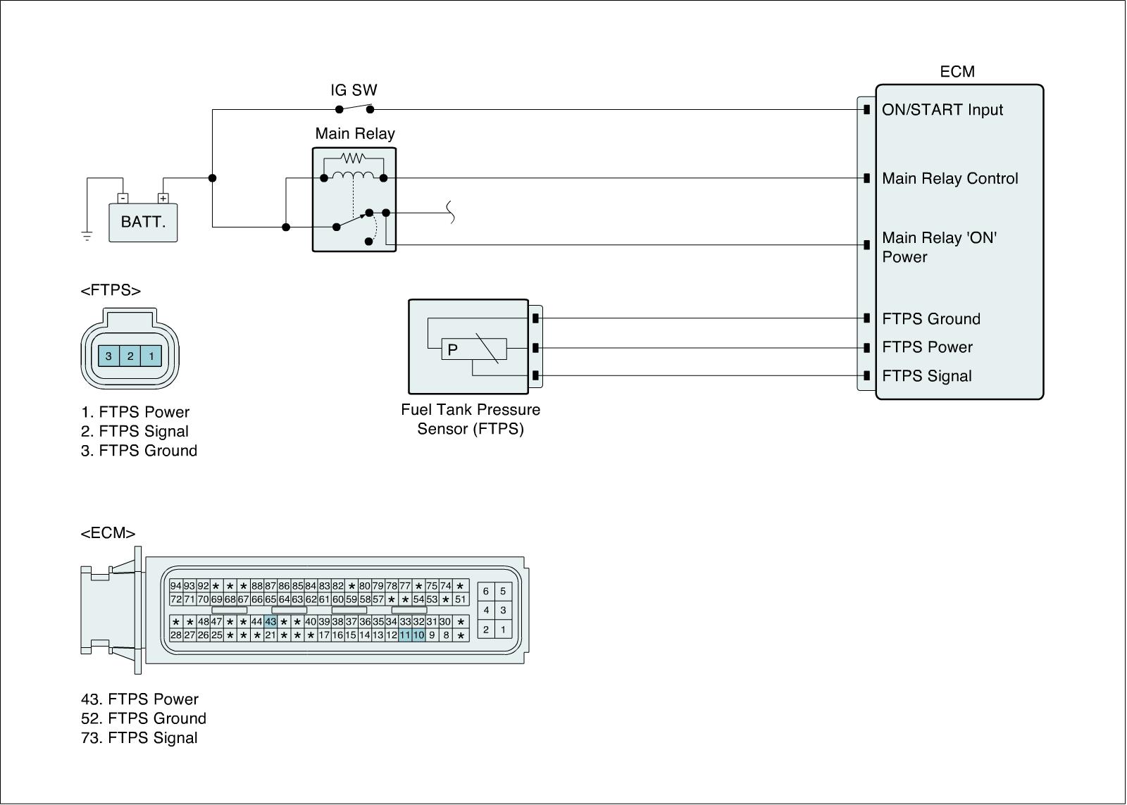 The evaporative emission control system prevents hydrocarbon vapors from escaping from the fuel tank into the atmosphere where they could form photochemical smog. Gasoline vapors are collected in the charcoal canister. The Fuel Tank Pressure Sensor (FTPS) is an integral part of the evaporative monitoring system. The ECM monitors the FTPS signal to detect vacuum decay and excess vacuum. The FTPS measures the difference between the air pressure inside the fuel tank and outside air pressure to check the purge control solenoid valve operation and for leak detection in the evaporative emission control system by monitoring pressure and vacuum levels in the fuel tank during the purge control solenoid valve operating cycles.