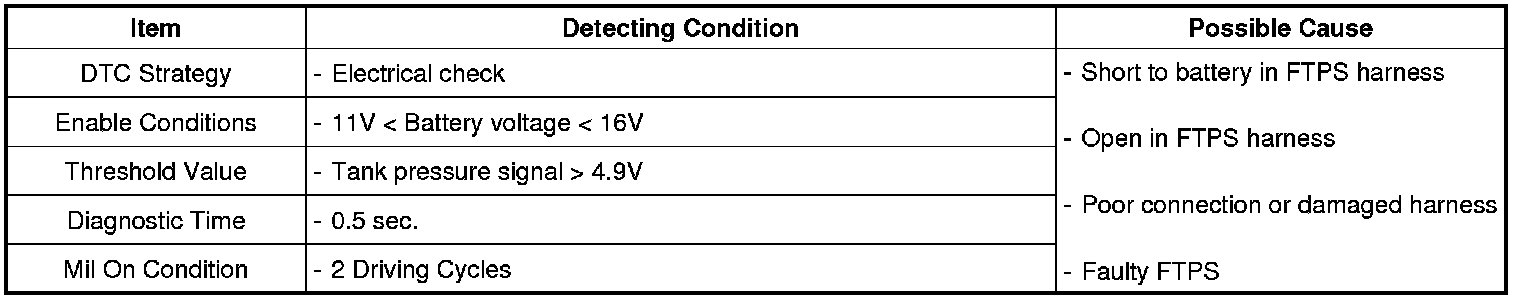 ECM sets DTC P0453 if the ECM detects signal voltage higher than the possible range of a properly operating FTPS.