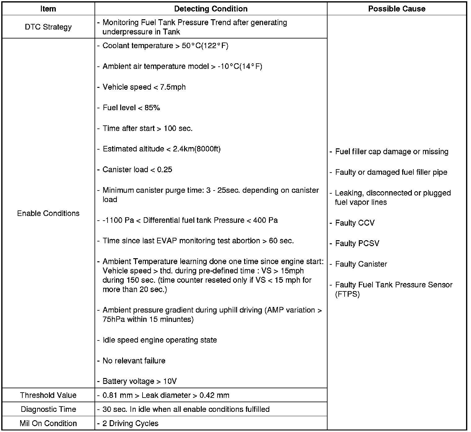 The ECM closes the Canister Close Valve (CCV) at the charcoal canister to seal off the evaporative emission system and then opens purge control valve (PCSV) to generate a vacuum in the fuel tank. After vacuum generation, the ECM measures pressure differential curve in the fuel tank and sets DTC P0442 or P0456 if the vacuum generated within a monitoring period increases above a defined threshold.