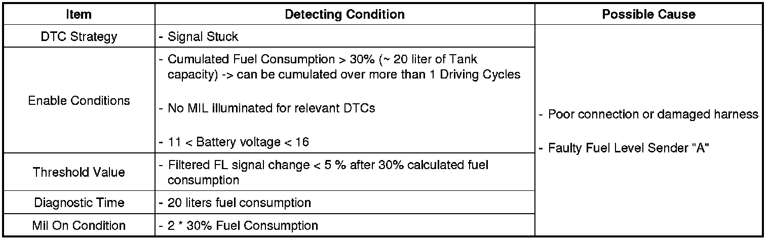 The Fuel Level Sensor(FLS) measures the fuel level in fuel tank and its information is used to supply the ECM with information regarding the monitoring condition of the EVAP canister purge system for leak detection. If the fuel level sensor is monitored for high or low stuck or difference between voltage of fuel level sensor and voltage deviation of fuel level sensor is exceeds limited value while driving, this is interpreted by the ECM as a fault.