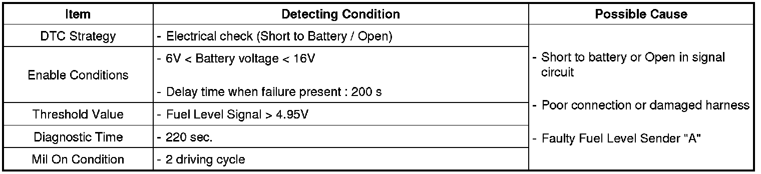 The Fuel Level Sensor(FLS) measures the fuel level in fuel tank and its information is used to supply the ECM with information regarding the monitoring condition of the EVAP canister purge system for leak detection. If the fuel level sensor is monitored for high or low stuck or difference between voltage of fuel level sensor and voltage deviation of fuel level sensor is exceeds limited value while driving, this is interpreted by the ECM as a fault.