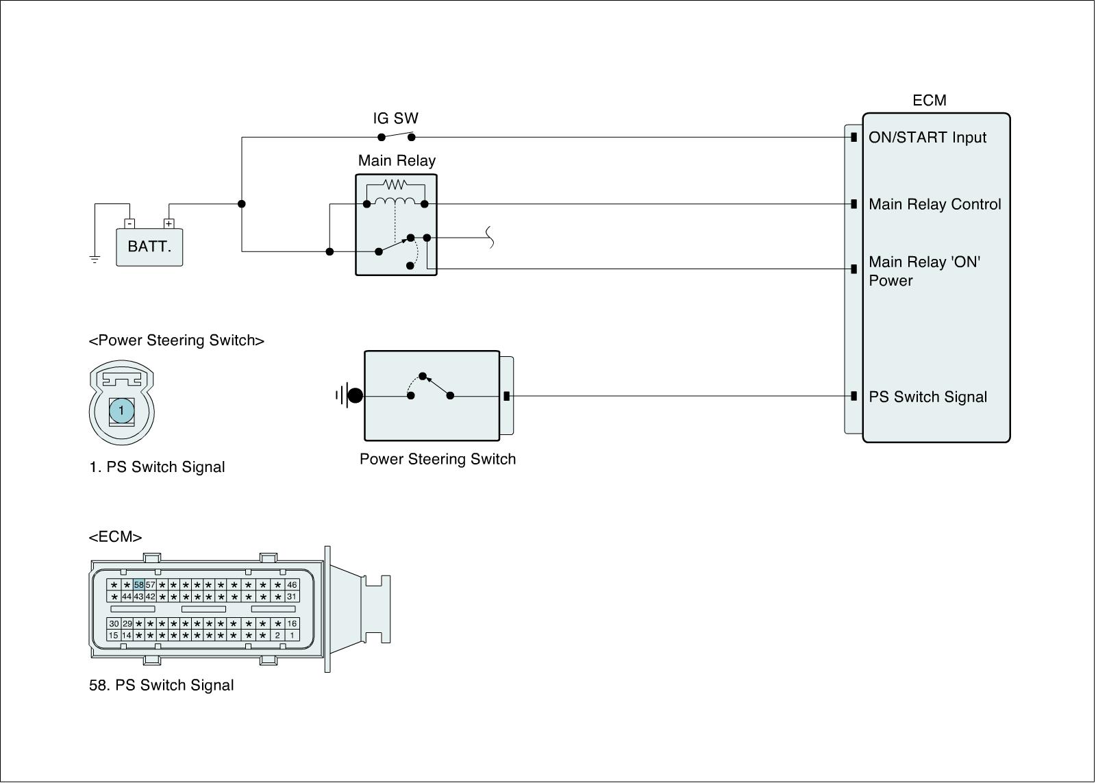 To reduce the required power to manipulate steering wheel, hydraulic pressure is used in power steering system. A load is sensed at steering oil pressure sensor then inputted to ECM as a wheel position signal. Controlling idle speed valve, ECM performs appropriate electric load correction With this signal.