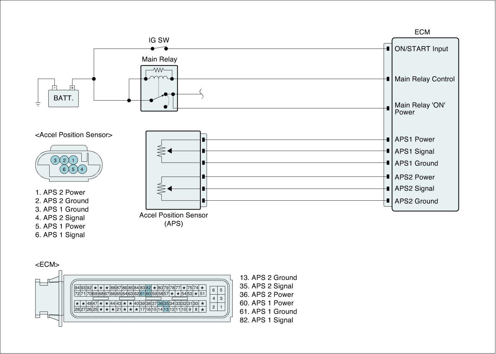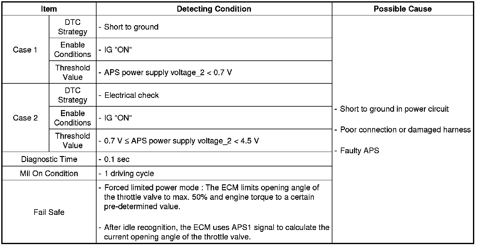 The ECM provides a 5volt reference voltage to the Acceleration Position Sensor1(APS2). The ECM monitors reference voltage deviation from the power supply circuit of the APS2.