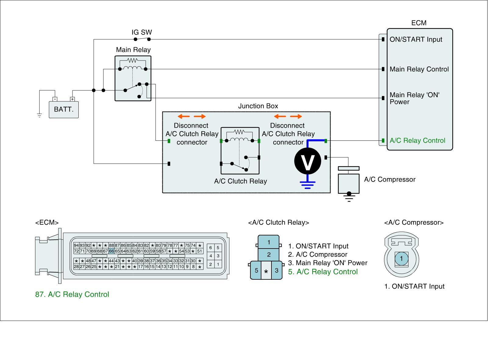 4. Measure voltage between control terminal of A/C Relay harness side and chassis ground.