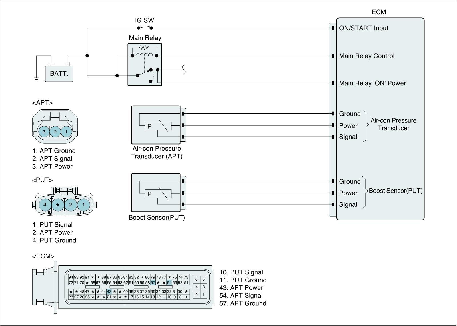 The ECM provides a 5volt reference voltage to the Air-con Pressure Transducer(APT) and PUT. The ECM monitors reference voltage deviation from the power supply circuit of the APT and PUT.
