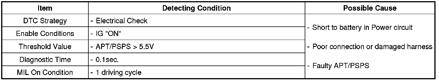 The ECM provides a 5volt reference voltage to the Air-con Pressure Transducer(APT) and Power Steering Pressure Sensor(PSPS). The ECM monitors reference voltage deviation from the power supply circuit of the APT and PSPS.