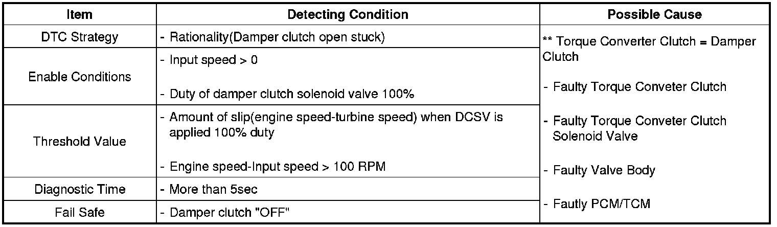 To decrease the slip of the Damper Clutch, the TCM increases the duty ratio by appling more hyraulic pressure. When slip rpm does not drop under some value with 100% duty ratio, the PCM/TCM determines that the Torque Converter Clutch is stuck OFF and sets this code.
