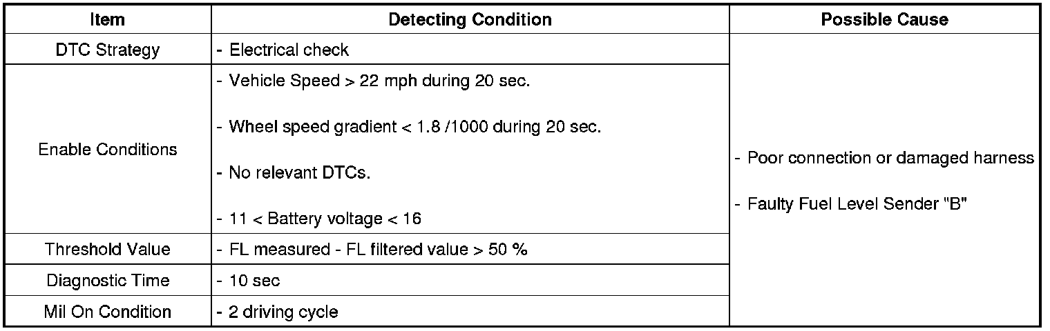 The Fuel Level Sensor(FLS) measures the fuel level in fuel tank and its information is used to supply the ECM with information regarding the monitoring condition of the EVAP canister purge system for leak detection. If the fuel level sensor is monitored for high or low stuck or difference between voltage of fuel level sensor and voltage deviation of fuel level sensor is exceeds limited value while driving, this is interpreted by the ECM as a fault.