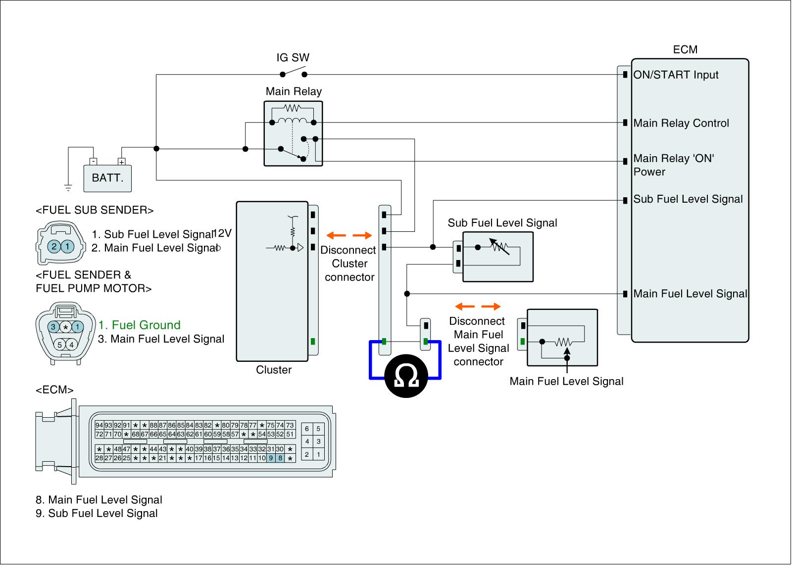 1. IG "OFF" and disconnect Instrument cluster connector, Fuel Sender A & Fuel Pump Motor connector, and Fuel Sub Sender connector.