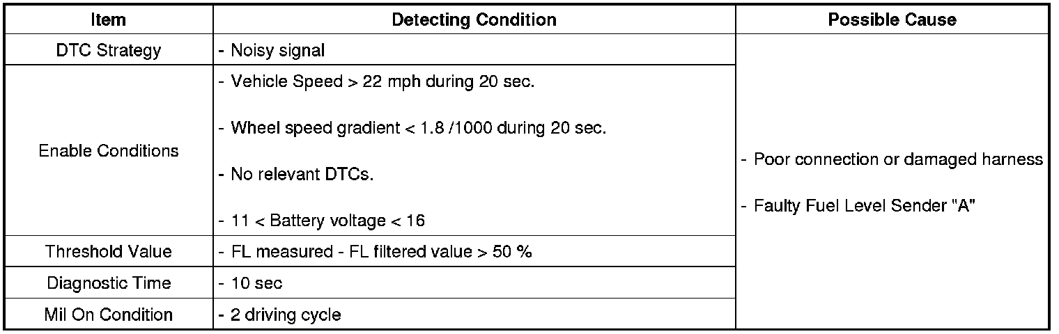 The Fuel Level Sensor(FLS) measures the fuel level in fuel tank and its information is used to supply the ECM with information regarding the monitoring condition of the EVAP canister purge system for leak detection. If the fuel level sensor is monitored for high or low stuck or difference between voltage of fuel level sensor and voltage deviation of fuel level sensor is exceeds limited value while driving, this is interpreted by the ECM as a fault.