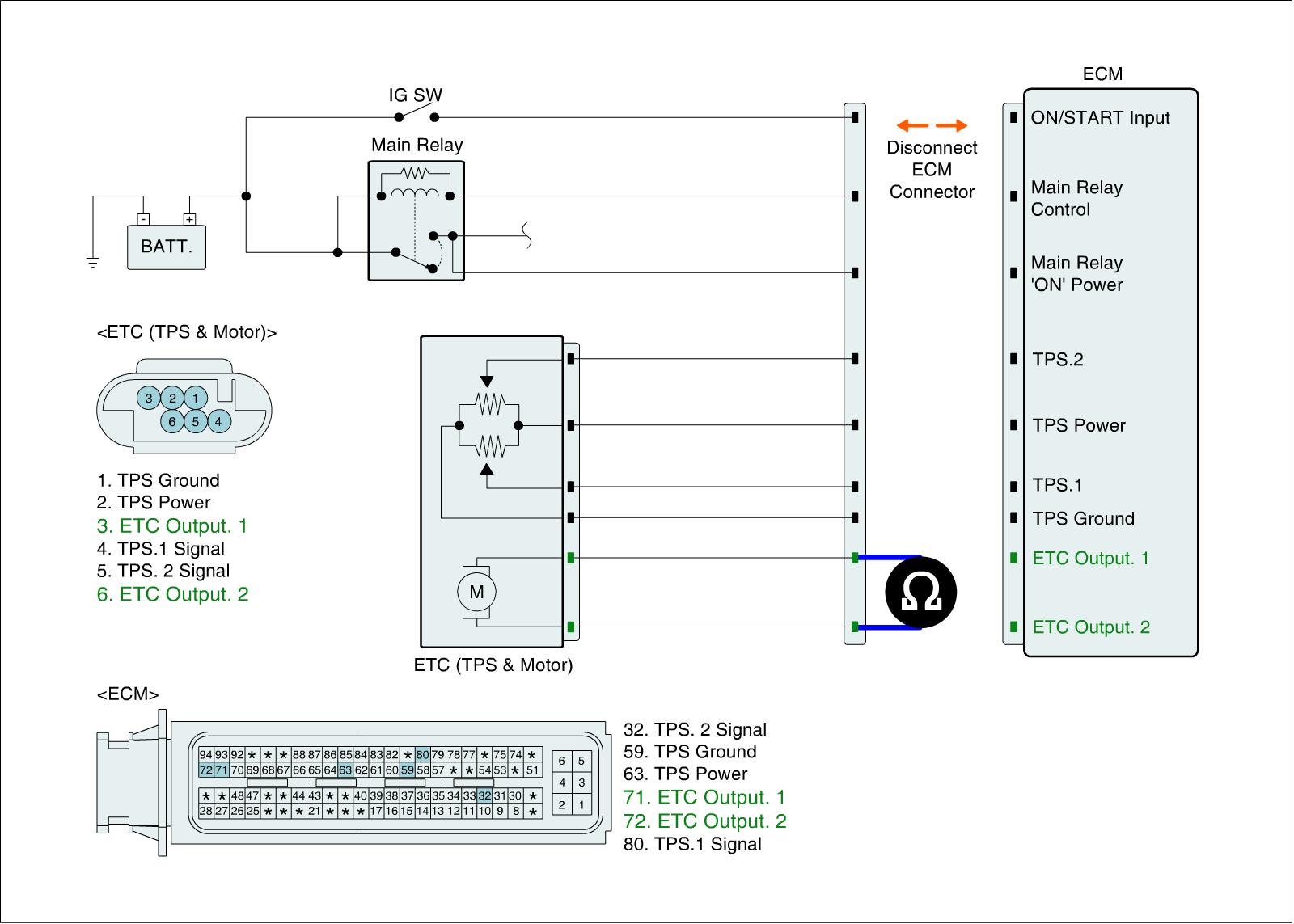 2. Measure resistance between 'ETC output 1' terminal and 'ETC output 2' terminal of ECM harness connector.