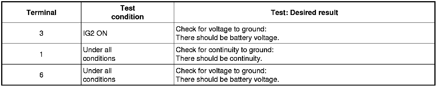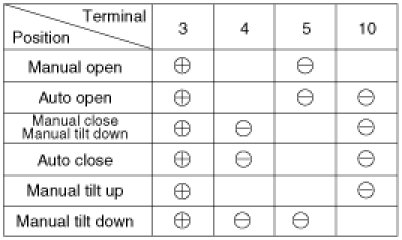 4. Ground the terminals as below table, and check that the sunroof unit operates as below table.