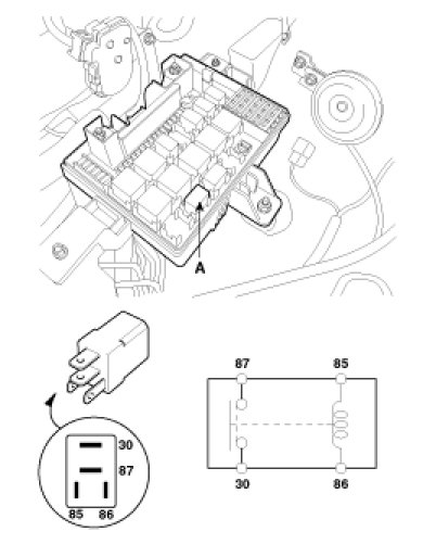 2. Pull out the front fog lamp relay(A) from the engine compartment relay box.