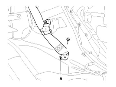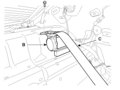 4. After loosening the retractor (B) mounting bolt, remove the rear seat belt (C).