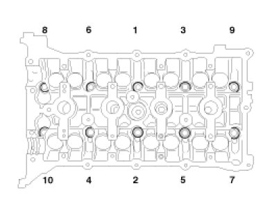 Using hexagon wrench, install and tighten the 10 cylinder head bolts and plate washers, in several passes, in the sequence shown.