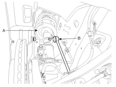2. Disconnect the stabilizer link(B) with the front strut assembly(A) after loosening the nut.