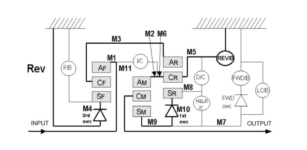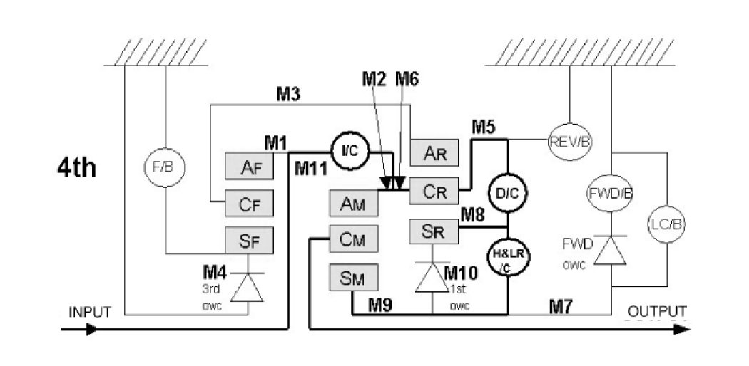 Input shaft->Front internal gear->Front carrier->Rear internal gear->Rear carrier->Middle internal gear-> Middle carrier->Output shaft