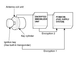 The RF signal from the transponder, received by the antenna coil, is converted into messages for serial communication by the immobilizer unit device. And, the received messages from the PCM(ECM) are converted into an RF signal, which is transmitted to the transponder by the antenna.