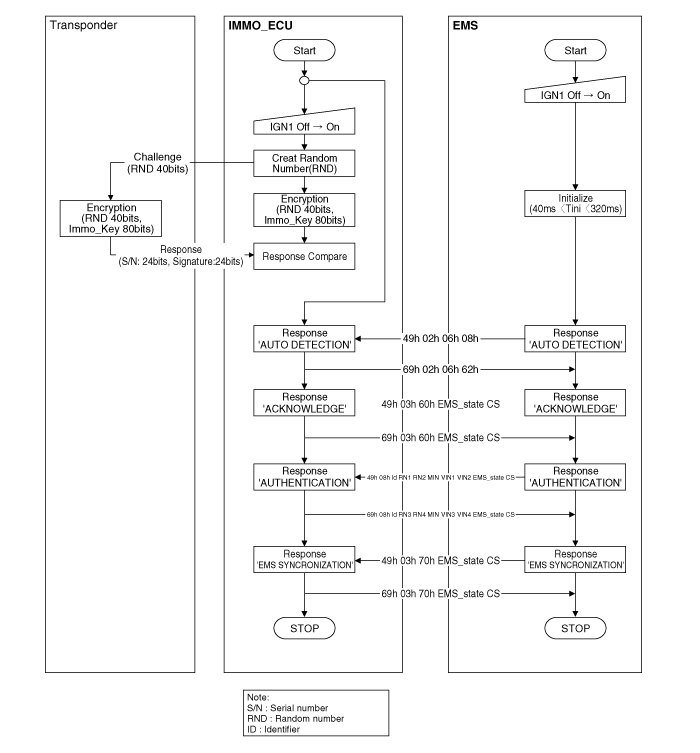 ERN (Encrypted Randorm Number) value between EMS and encrypted immobilizer unit is checked and the validity of coded key is decided by EMS.