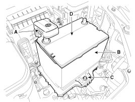 5. Remove the battery mounting bracket (C) by loosening the mounting bolt and then remove the battery (D).