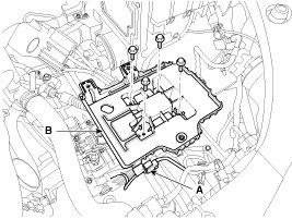 7. Disconnect the front connector (A) and then remove the battery tray (B).