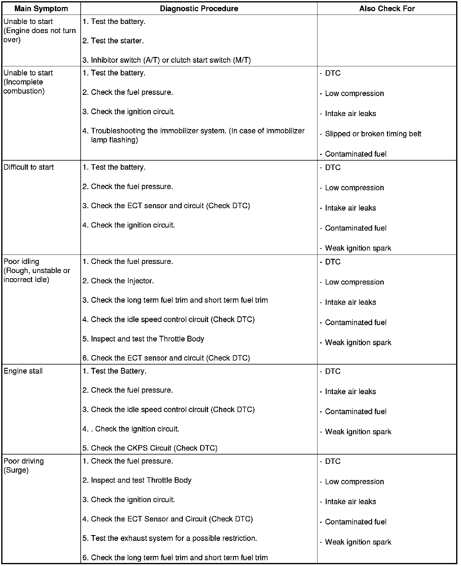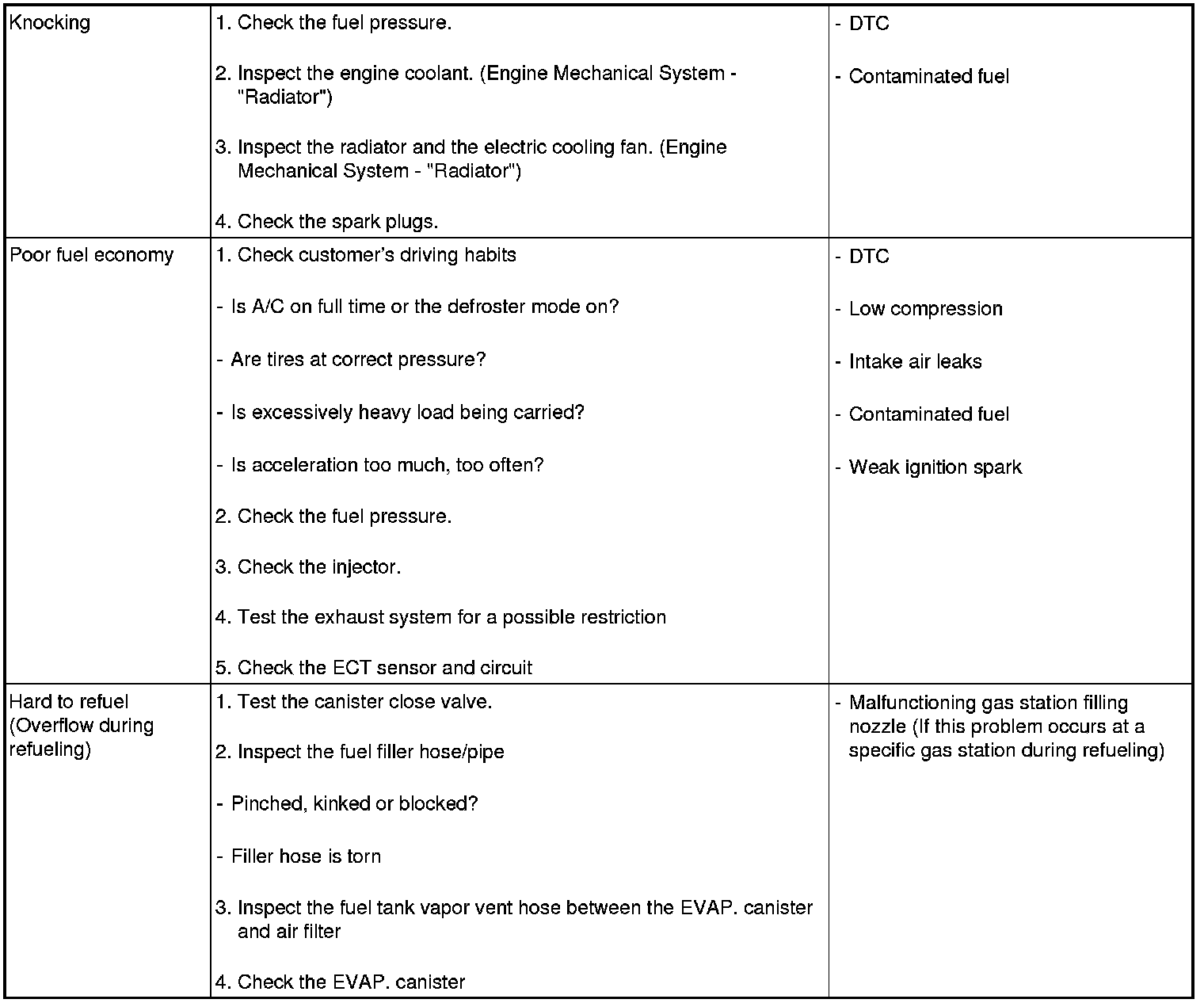 Sometimes the most difficult case in troubleshooting is when a problem symptom occurs but does not occur again during testing. An example would be if a problem appears only when the vehicle is cold but has not appeared when warm. In this case, the technician should thoroughly make out a "Customer Problem Analysis Sheet" and recreate (simulate) the environment and condition which occurred when the vehicle was having the issue.