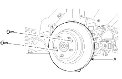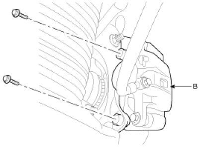 4. Remove the brake caliper mounting bolts (A), and then place the brake caliper assembly (B) with wire as shown in the illustration.