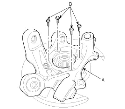 13. Remove the hub assembly mount bolts(B) from the rear axle carrier(A).
