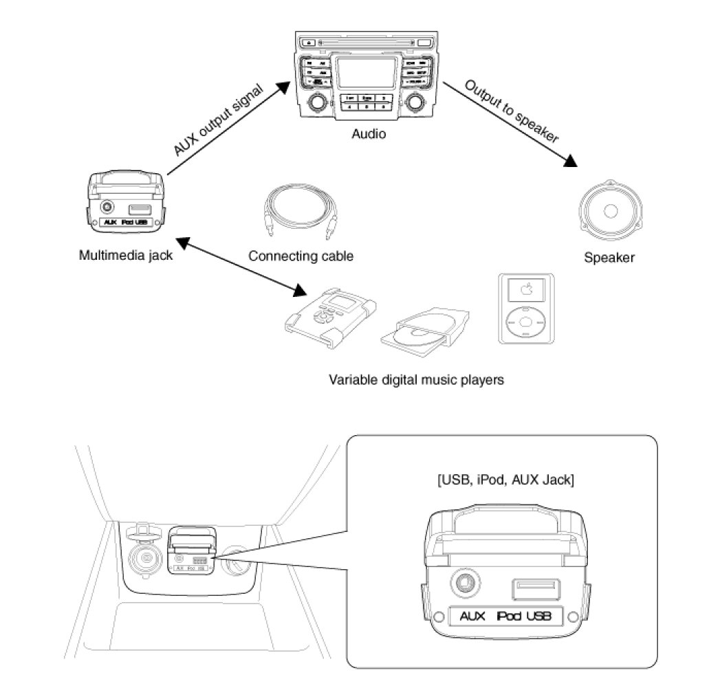 The multimedia jack on the console upper cover is for customers who like to listen to external portable music players like the MP3, iPod and etc., through the vehicle's sound system when it is linked to this jack. The customer has this added option.