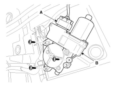 3. After loosening the mounting screws, then remove the power window motor (B).