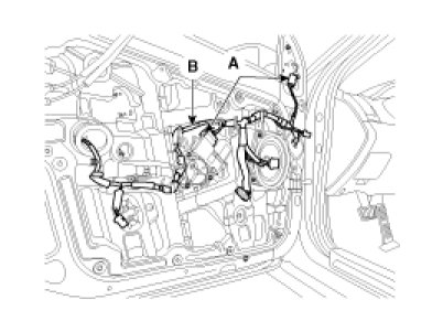 4. Disconnect the connectors (A) and door module wiring harness (B).