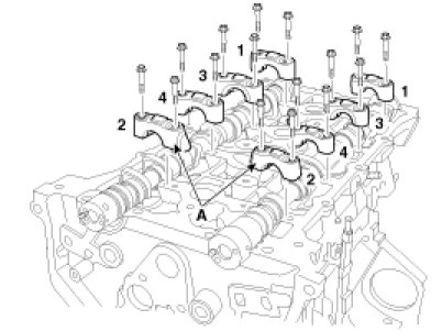 (2) Remove the camshaft bearing cap (A) in the sequence shown.