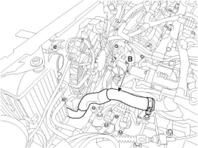 8. Disconnect the radiator upper hose (A) and lower hose (B).