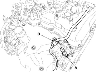(1) Disconnect the exhaust OCV (Oil control valve) connector (A) and the oxygen sensor connector (B).