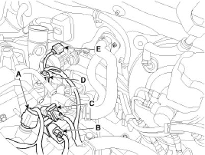 (5) Disconnect the ECTS (Engine coolant temperature sensor) connector (A), the condenser connector (B), the CKPS (Crankshaft position sensor) connector (C), the exhaust CMPS (Camshaft position sensor) connector (D) and the electric wastegate actuator connector (E).