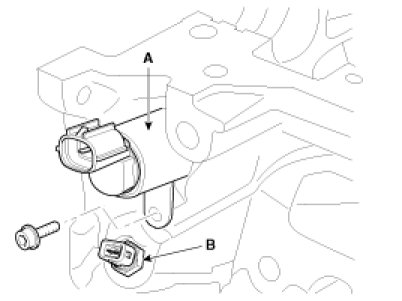 22. Remove the intake OCV (Oil control valve) (A) using a torx wrench and the OTS (Oil temperature sensor) (B).