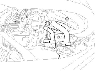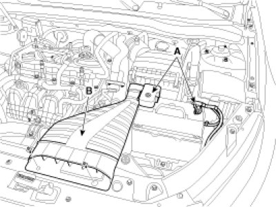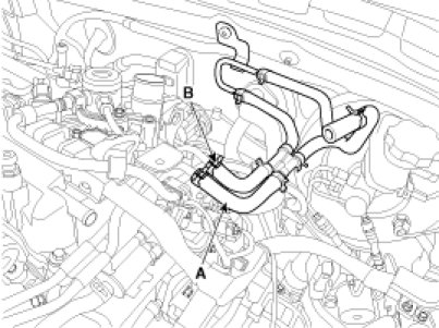 12. Disconnect the radiator upper hose (A) and lower hose (B).