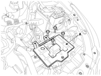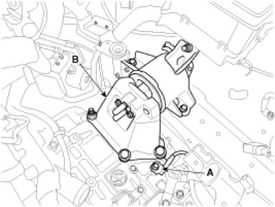 31. Disconnect the ground line (A), and then remove the transaxle mounting support bracket (B).
