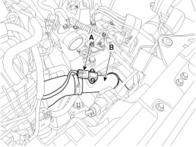 19. Disconnect the fuel hose (A) and PCSV (Purge control solenoid valve) hose (B).
