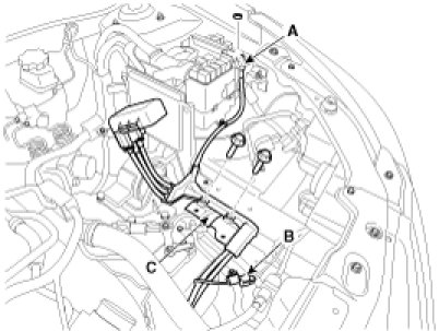 14. Disconnect the (+) cable (A) from the fuse/relay box and the front connector (B). Then remove the wiring protector (C).