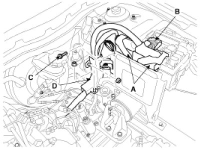 15. Disconnect the ECM connectors (A) from the ECM, the fuse box connector (B) from the fuse/relay box and the engine ground line (C). Then remove the wiring protector (D).