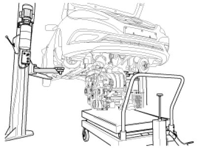 - After removing the sub frame mounting bolt, the engine and transaxle assembly may fall downward, and so support them securely with floor jack.