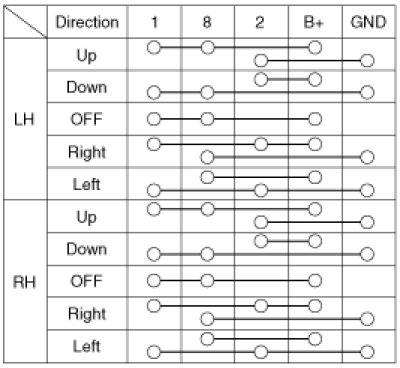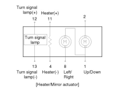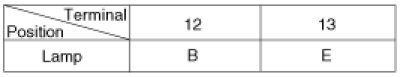 3. Apply battery voltage to each terminal as shown in the table and verify that the mirror operates properly.