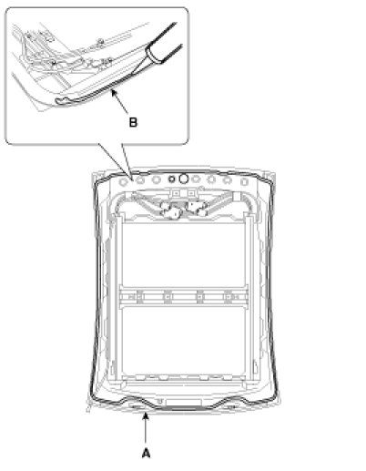 14. Cut off the sealant by pulling the piano wire (A) around the back panoramaroof assembly (B).