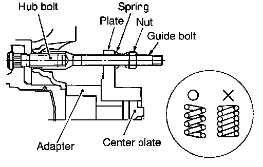 4. Insert plate on guide bolt. Put spring in, and then evenly screw both guide bolt nut. When fastening guide bolt nut, do not completely compress spring.