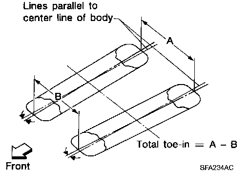 Measure toe-in using following procedure. If out of the specification, inspect and replace any damaged or worn rear suspension parts.