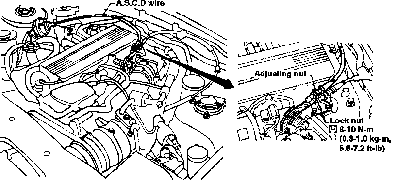 Loosen locknut Fig. 91. With throttle closed turn adjusting nut 1/2 to 1 turn in the direction that will loosen A.S.C.D. wire, then secure locknut. A.S.C.D. wire should not hold throttle open at idle position.
