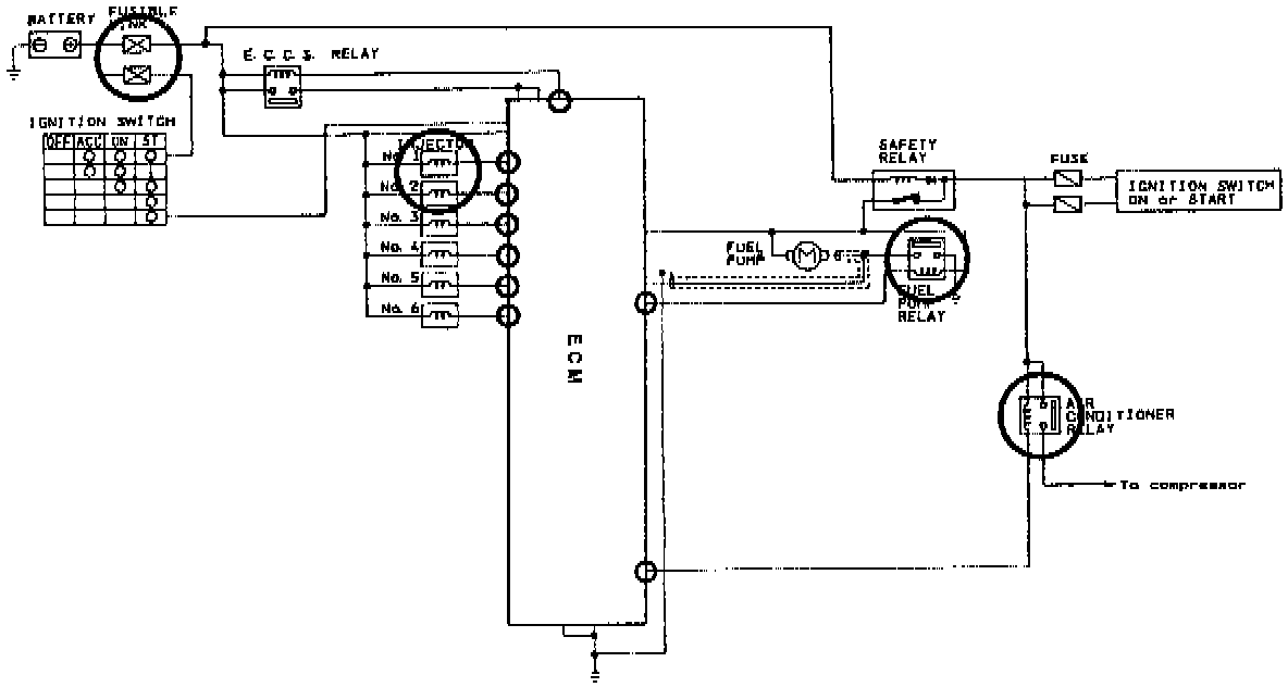 1. Most relays in the ECCS system (Fuel pump1 A/C, etc.) and actuators (Injectors, etc.) are powered by the battery. The ECM controls the relay or actuator by supplying the ground.