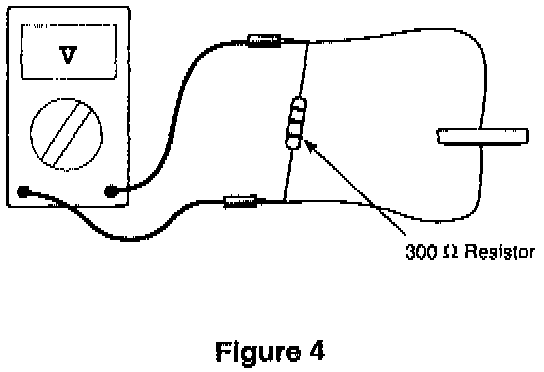 4. Use a high impedance volt-ohmmeter and a 300 ohm resistor in parallel to check the voltage of the remote controller battery. (Figure 4) If 2.5 volts or greater, the battery is O.K. If less than 2.5 volts, replace the battery. (300 ohm resistors are available from local electronics suppliers, e.g. Radio Shack.)