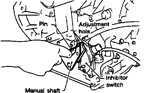 4. Insert suitable pin (4 mm 0.16 in) into adjustment holes in both inhibitor switch and manual shaft as near vertical as possible, then tighten screws, Fig. 3.